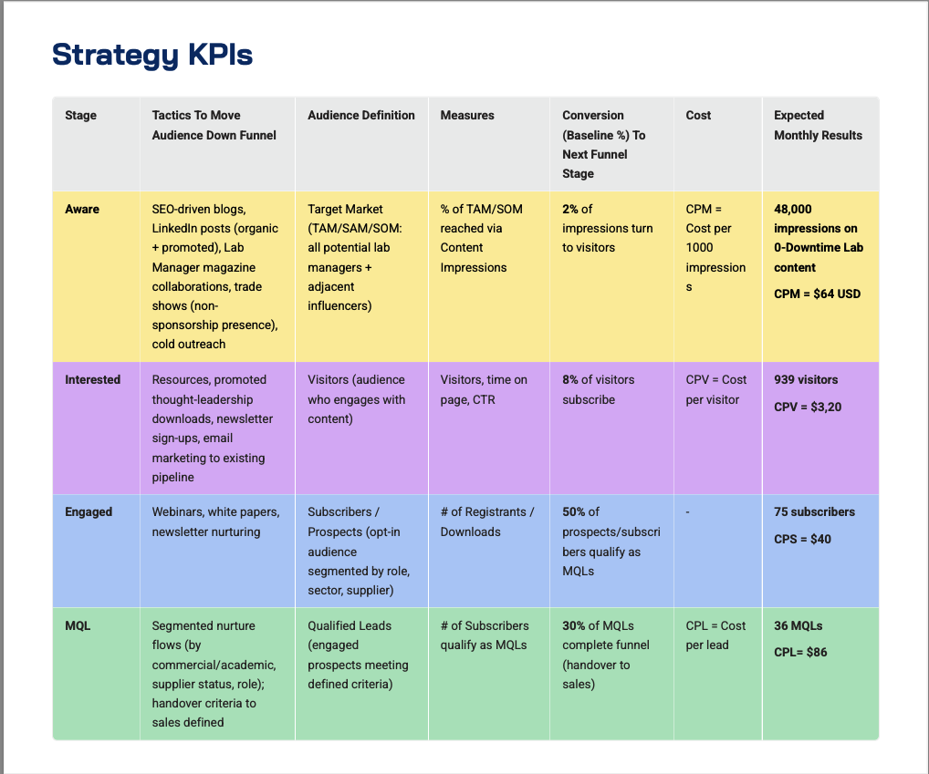 Who is in this stage (e.g. cold ICP, visitors, subscribers, engaged leads)Measures