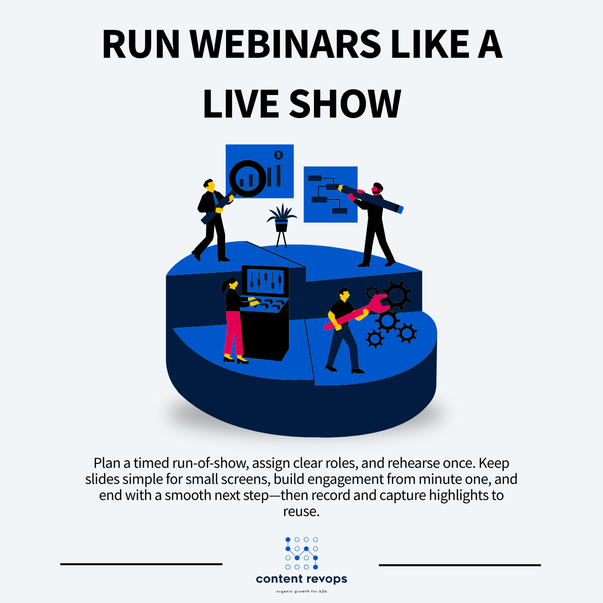 Disciplined production (roles, run-of-show, rehearsals, engagement prompts) so the event runs like a mini live show with clear ownership, rehearsals, and engagement beats built in across the entire webinar life cycle](https://contentmarketinginstitute.com/video-visual-content/webinar-planning-checklist-for-content-marketing-from-let-s-do-it-to-action).