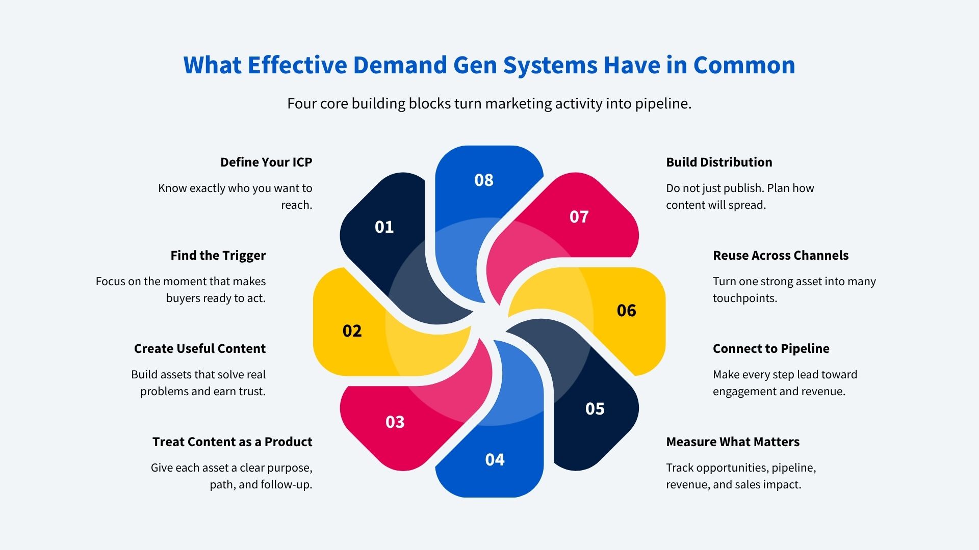 Every demand gen example that actually builds pipeline (not just “marketing activity”) shares four ingredients. Get these right and the tactics become interchangeable.