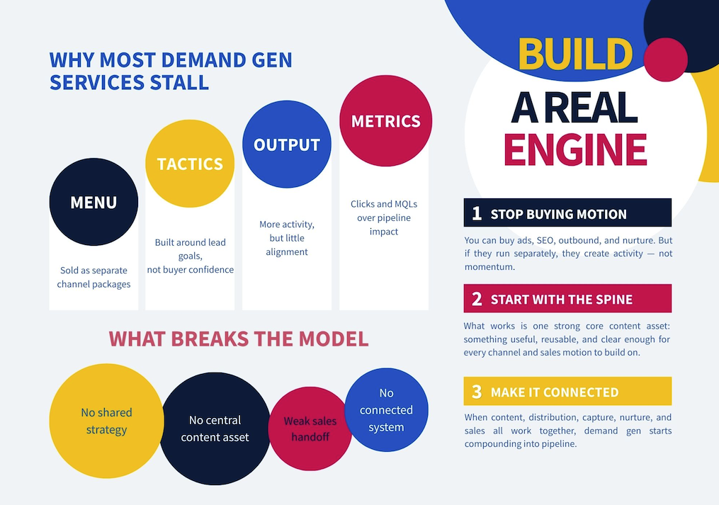 That’s the core issue: most “demand gen” is sold as disconnected execution, not a system. Lots of motion (campaigns, standups, dashboards), very little durable momentum. Ads run out of creative fuel. Outbound gets ignored. SEO takes too long to matter. Content gets published, then dies in a folder because it isn’t wired into sales, routing, or follow-up.
