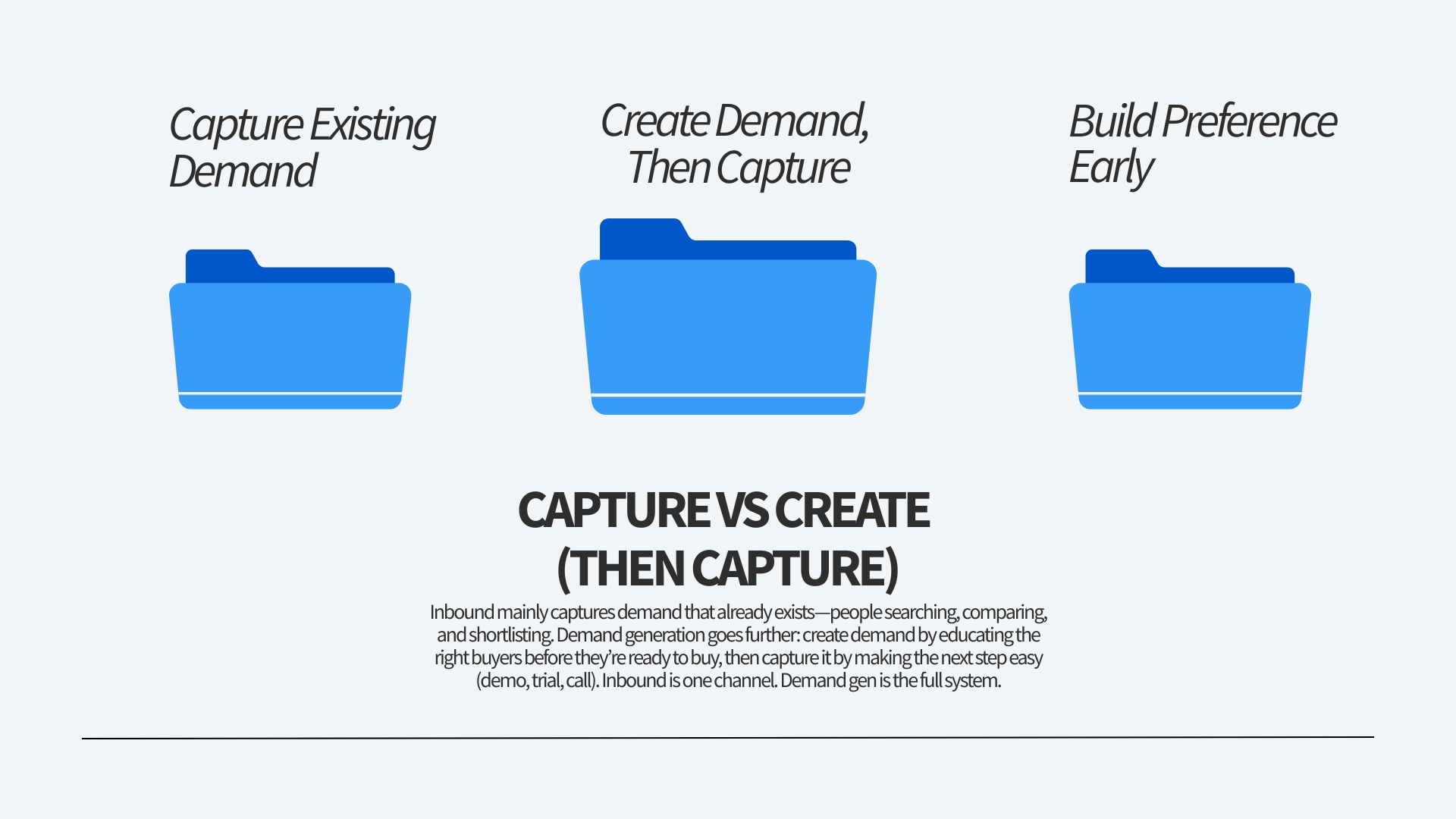 Inbound’s primary job is to capture existing demand—people already researching, shortlisting, and comparing. It helps you show up when someone types a query, clicks a comparison page, or fills out a form, which is why it behaves much more like lead generation and demand capture than like true demand creation.