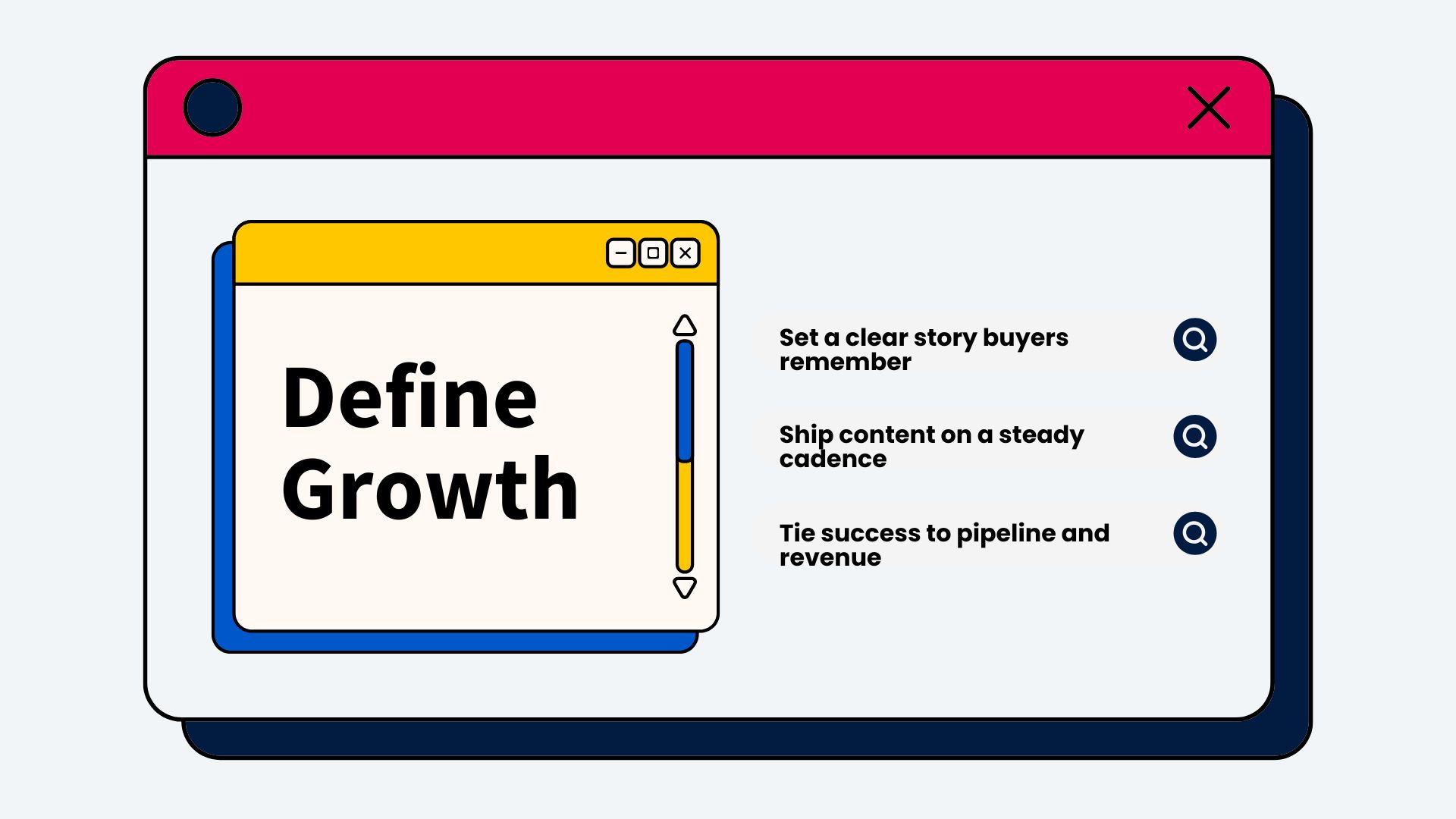 From there, pick one primary commercial theme tied to a high-intent pain in that ICP. This becomes the spine: the narrative that content, offers, and campaigns hang off of. Without that throughline, “growth” quickly becomes channel-chasing—lots of motion, little compounding. In contrast, teams that treat demand gen as a repeatable system anchored in a single, buyer-led story see much higher returns from content, events, and paid programs over time.