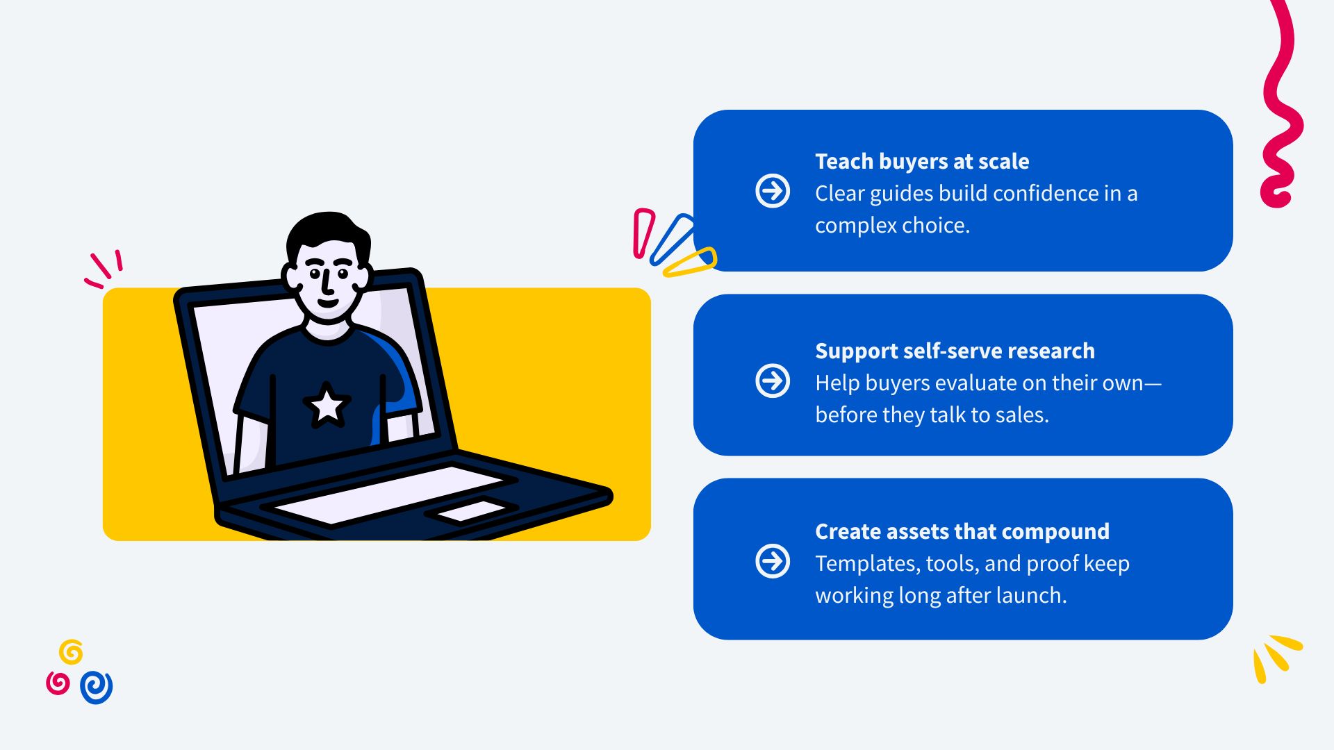 When you lead with workshops, explainers, templates, and practical guides, you give buyers a way to understand the problem, compare approaches, and anticipate tradeoffs. In SaaS, that education becomes the product’s “pre-onboarding,” building confidence before anyone clicks Book a demo and functioning as buyer enablement, not just promotion.