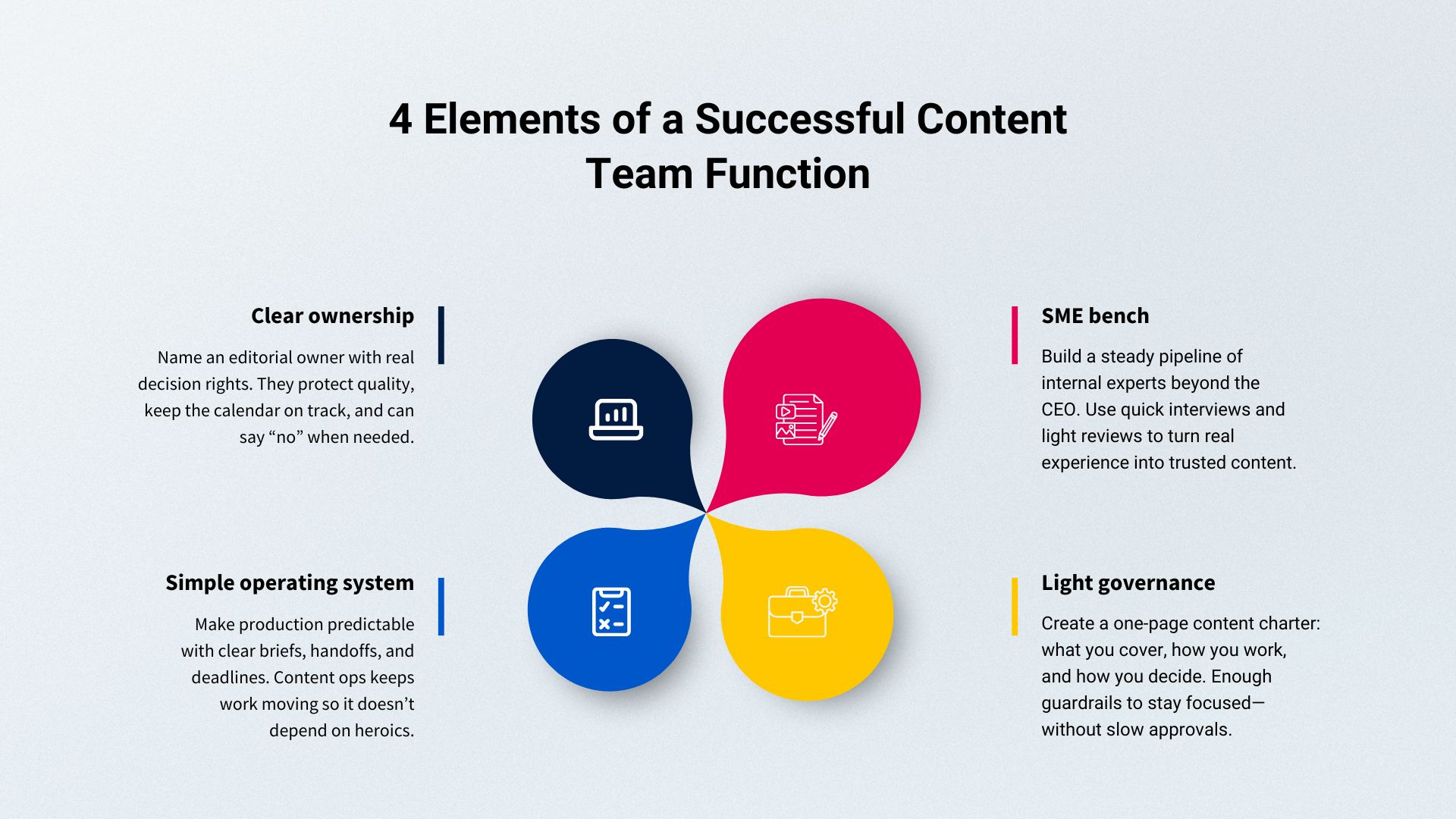 If content is going to shorten sales cycles and improve customer outcomes, it can’t live as “marketing’s side project.” It needs clear ownership, a steady SME pipeline, and lightweight governance so the work compounds instead of resetting every quarter.