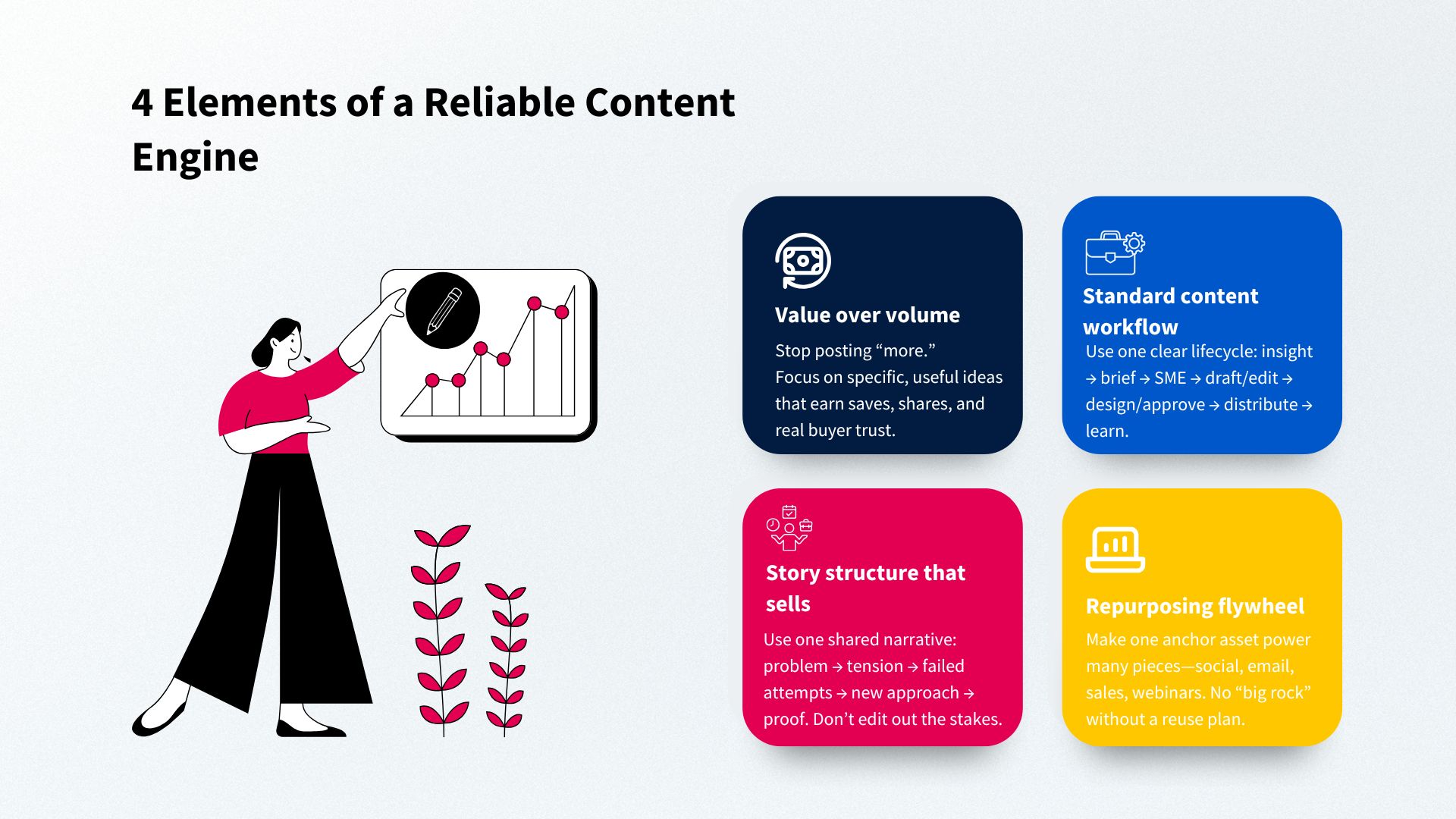 Most content programs fail because they operate as isolated campaigns. A stronger model is quarterly anchor plays: one substantial piece built for reuse and tied to a specific ICP and use case.