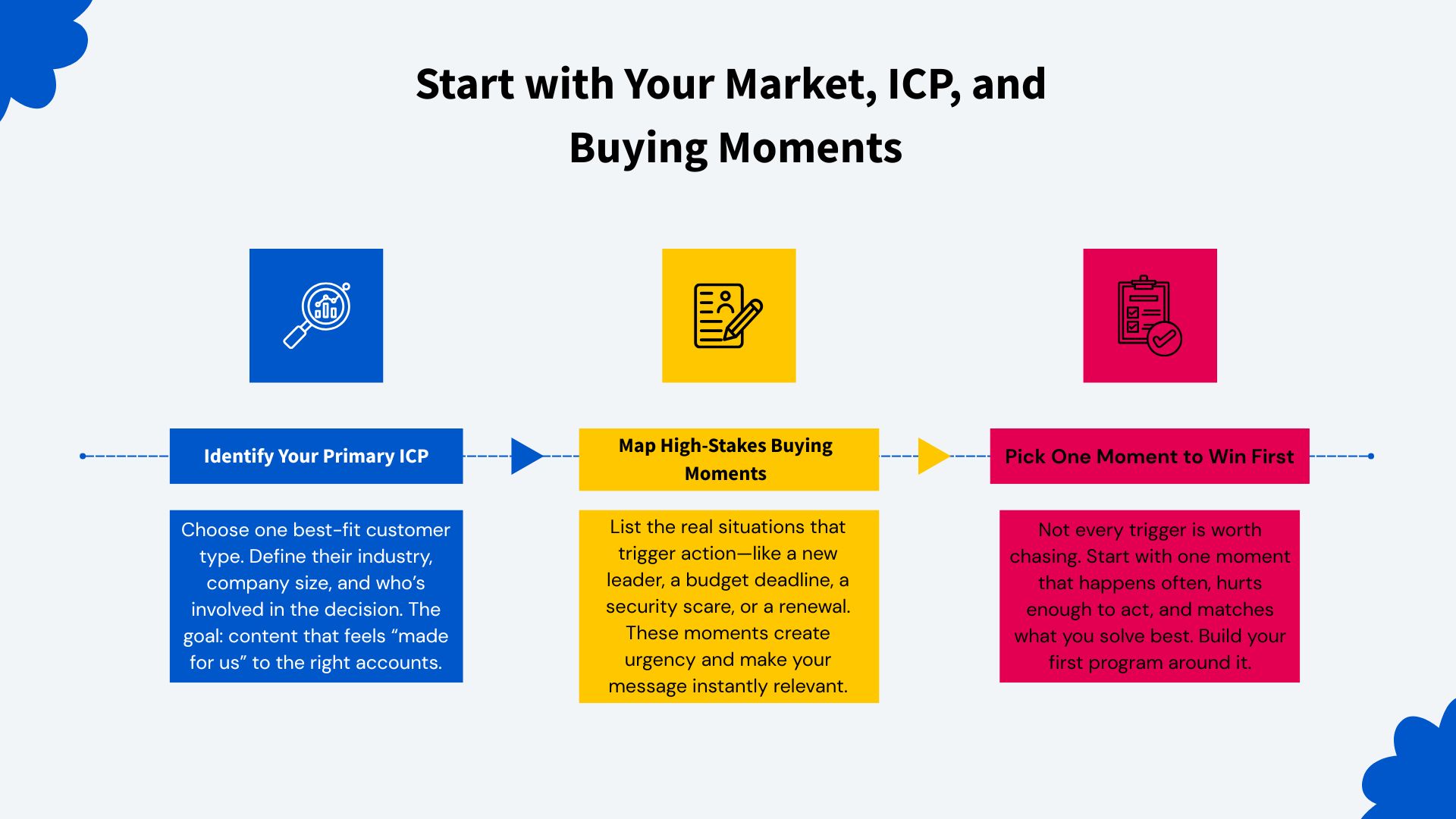 The output is your foundation: one ICP-in-a-moment that the entire demand strategy (and your flagship content product) will be built around, making it possible to architect an end-to-end path from initial trigger to revenue, and to measure impact at the level of situations, not just channels.