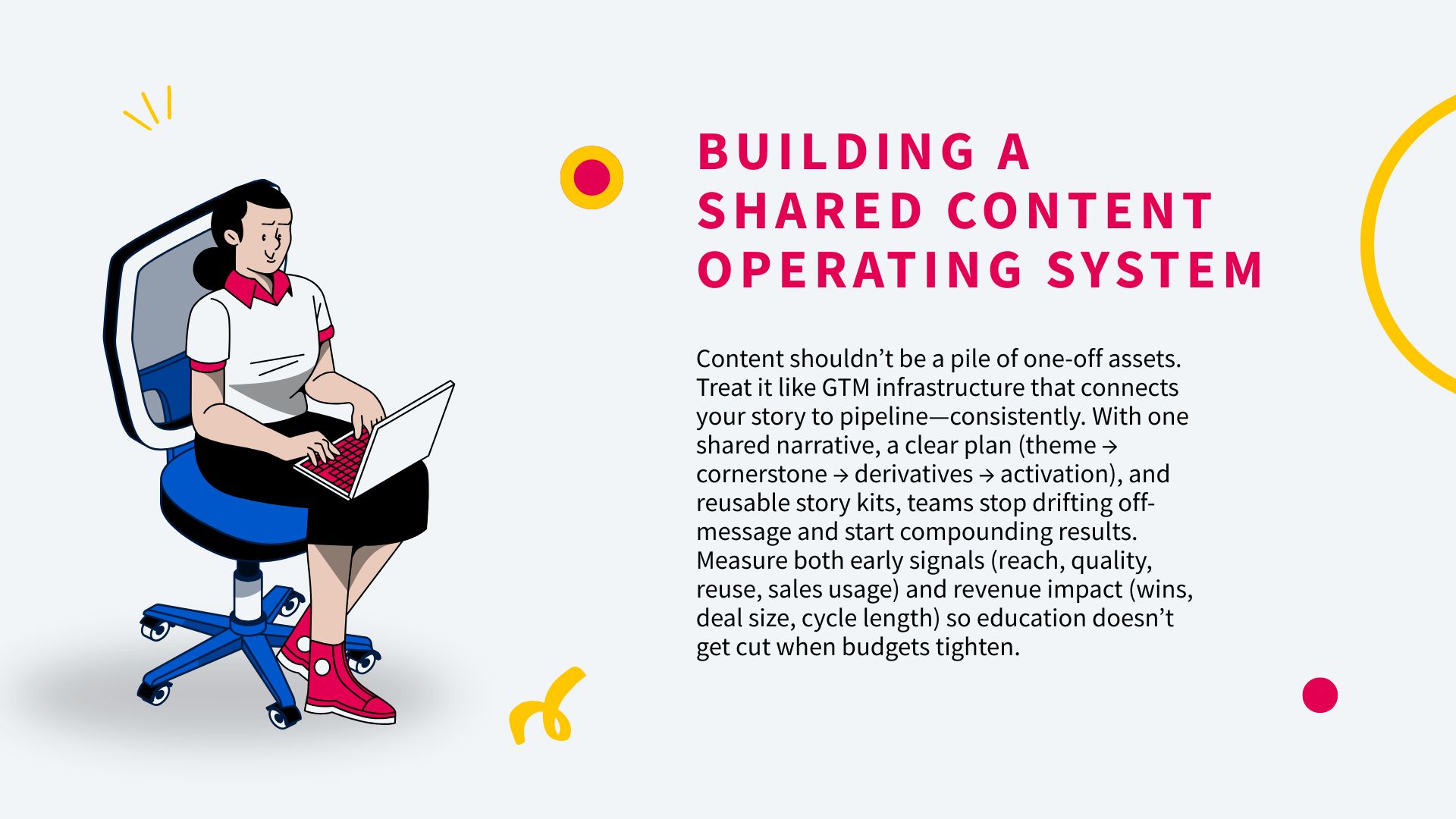 Operationalizing belief means treating content like a product. It should be a designed experience for a specific ICP. With each iteration, it should become better, clearer, and more valuable. It should not be just a stream of one-off assets. This mirrors how leading B2B orgs are shifting from “campaign collateral” to durable content products that build owned audiences over time.