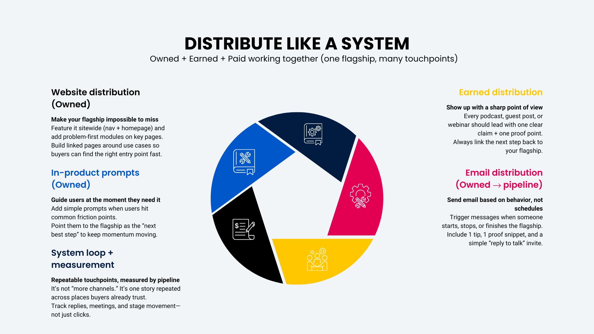 Distribute via a multi-channel engine (owned, earned, paid)