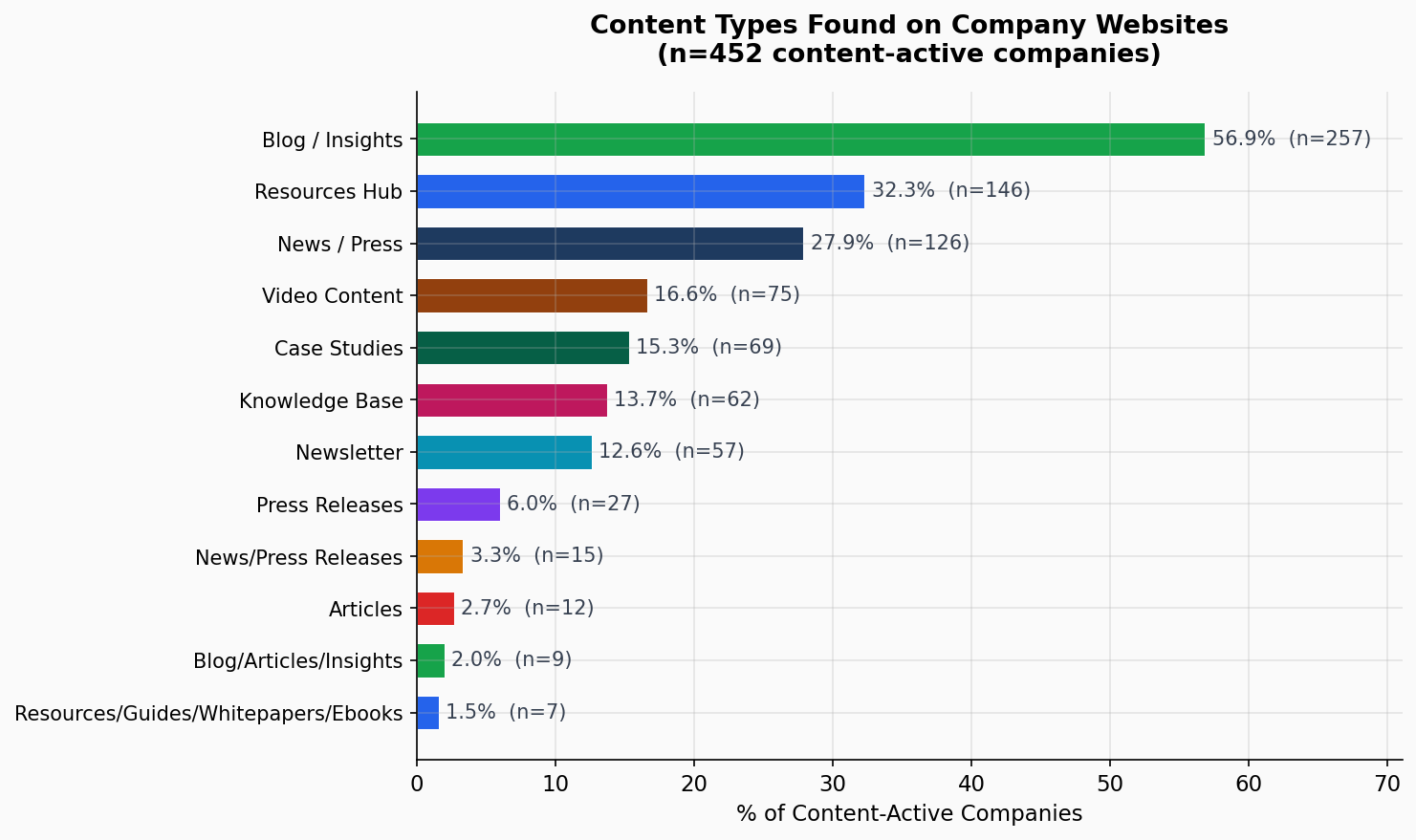 A blog still matters. In the research, 56.9% of content-active companies maintained a blog or insights section. But the stronger pattern was pairing blog/insights content with a resources hub or similar deeper content destination.