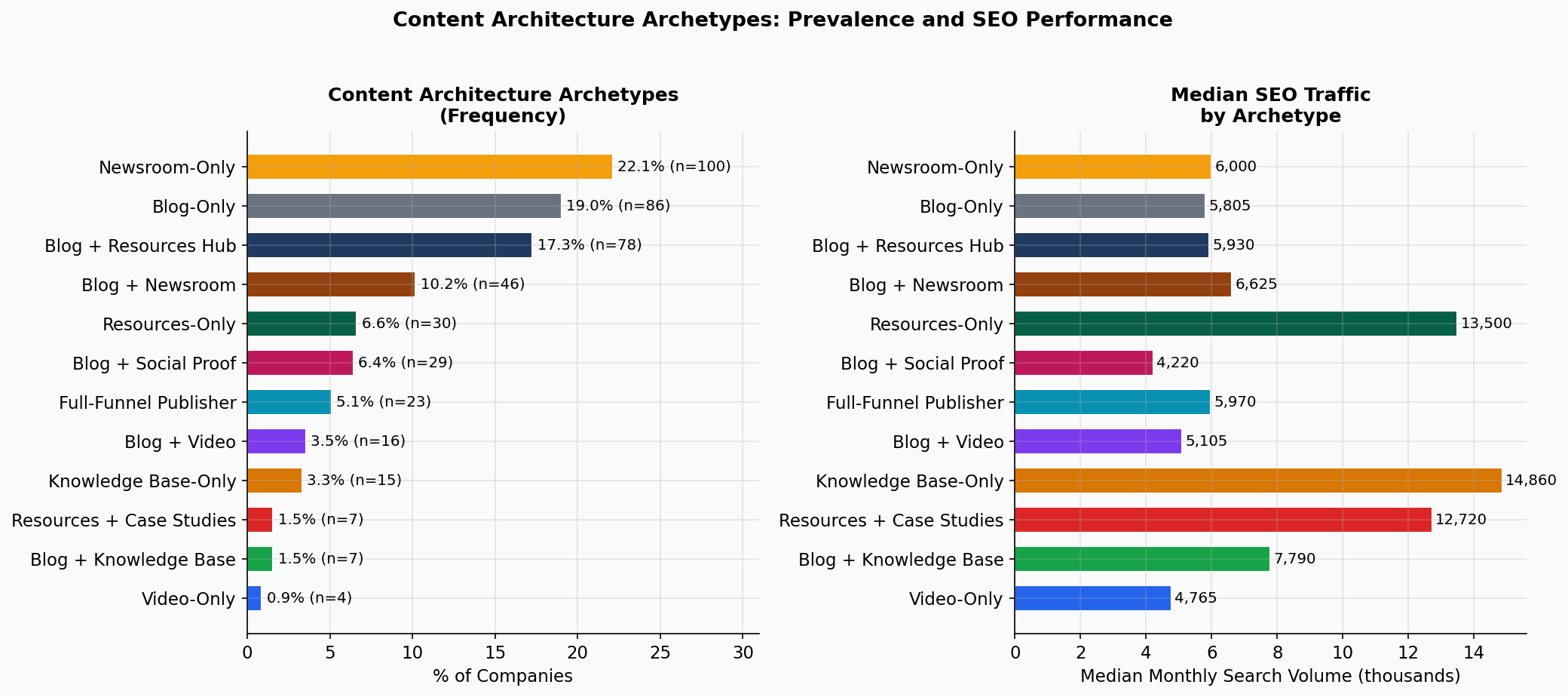 Our research found that the most common multi-type architecture was Blog + Resources Hub, while “knowledge base only” and “resources only” companies were high-performing outliers in organic traffic.