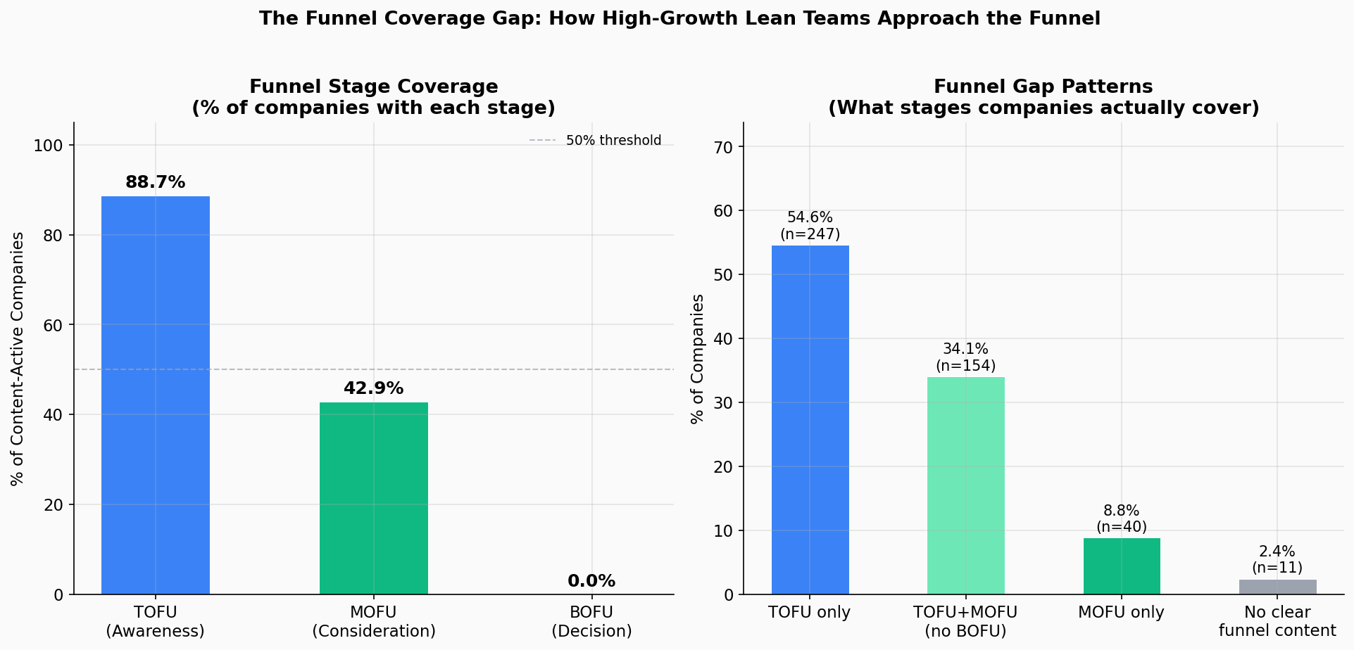 Most lean companies over-index on top-of-funnel content. The funnel analysis found that 88.7% of content-active companies hosted TOFU content, but only 42.9% hosted MOFU content. The most common pattern was TOFU-only, at 54.6%.