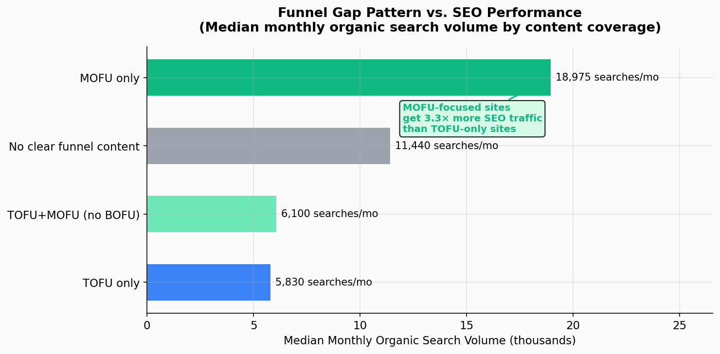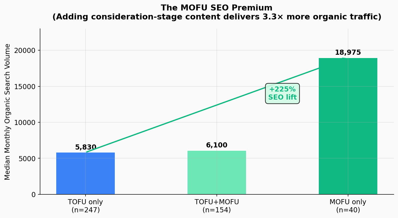 But the performance story points in the other direction. TOFU-only companies had 5,830 median monthly searches. TOFU+MOFU companies had 6,100. MOFU-only companies had 18,975, roughly 3.3 times the organic traffic of TOFU-only companies.