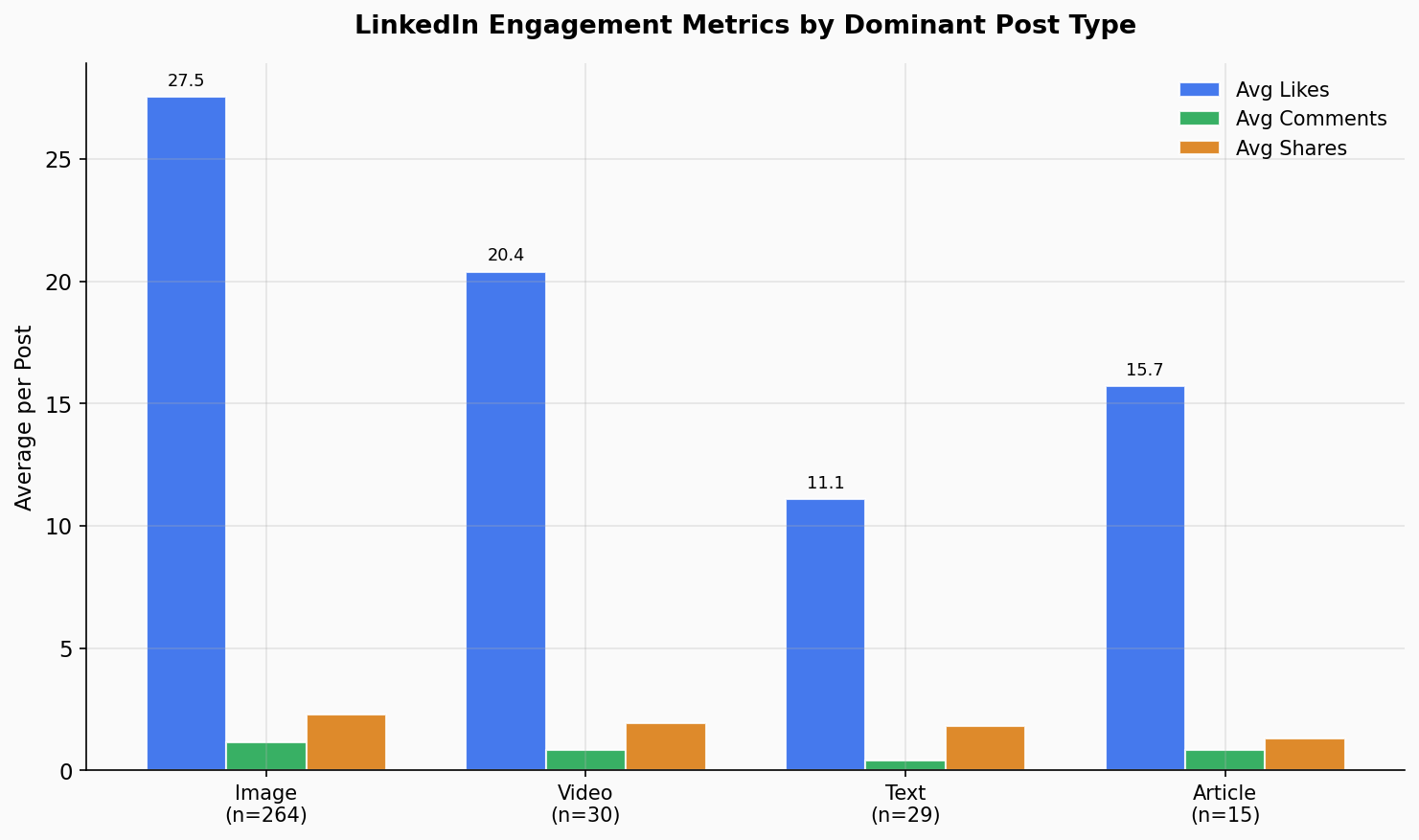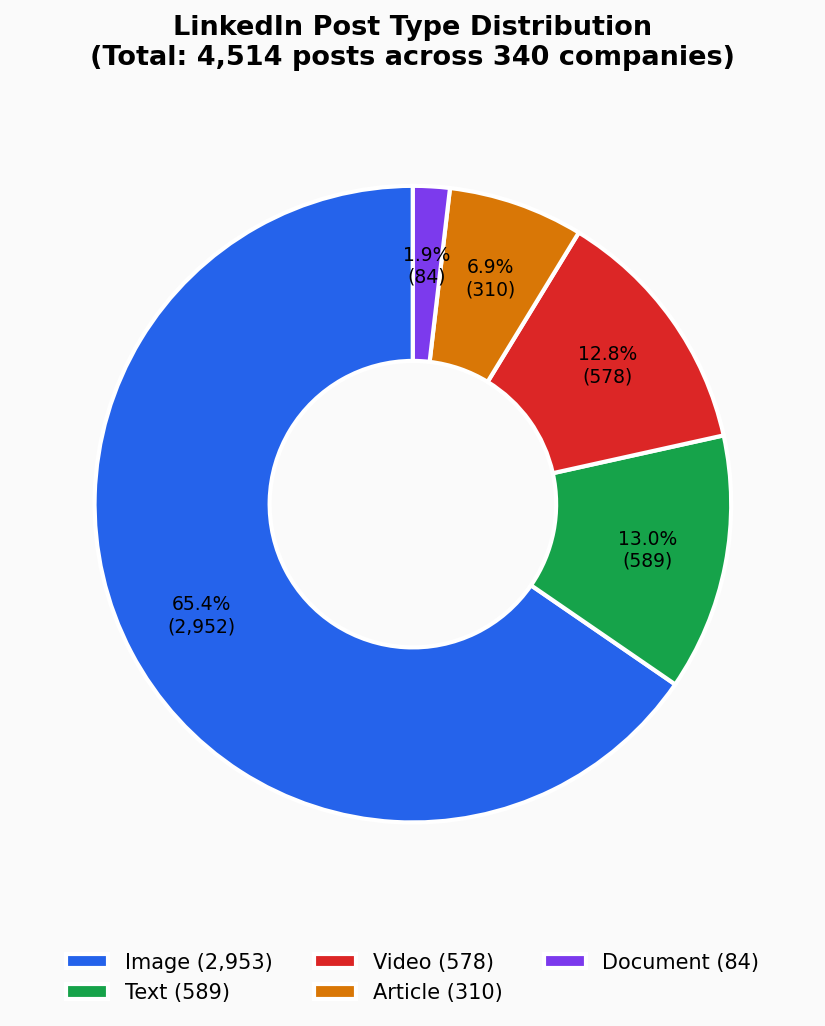 The research found that image-based LinkedIn posts dominated the analyzed B2B company pages, accounting for 77.5% of LinkedIn content and driving the highest average engagement.