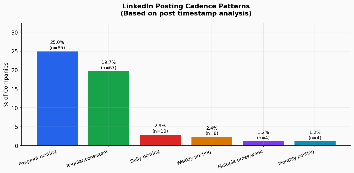 The research also found that daily posting is not necessary. Only 2.9% of the high-growth companies posted daily, while 46.8% posted at a regular cadence of roughly 2–4 times per week.