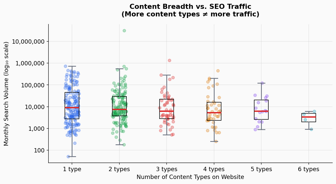 Our research found virtually no relationship between the number of content types a company hosted and search volume (quite the opposite actually). Lean teams were not winning by maintaining more formats; they were winning through focus and depth.