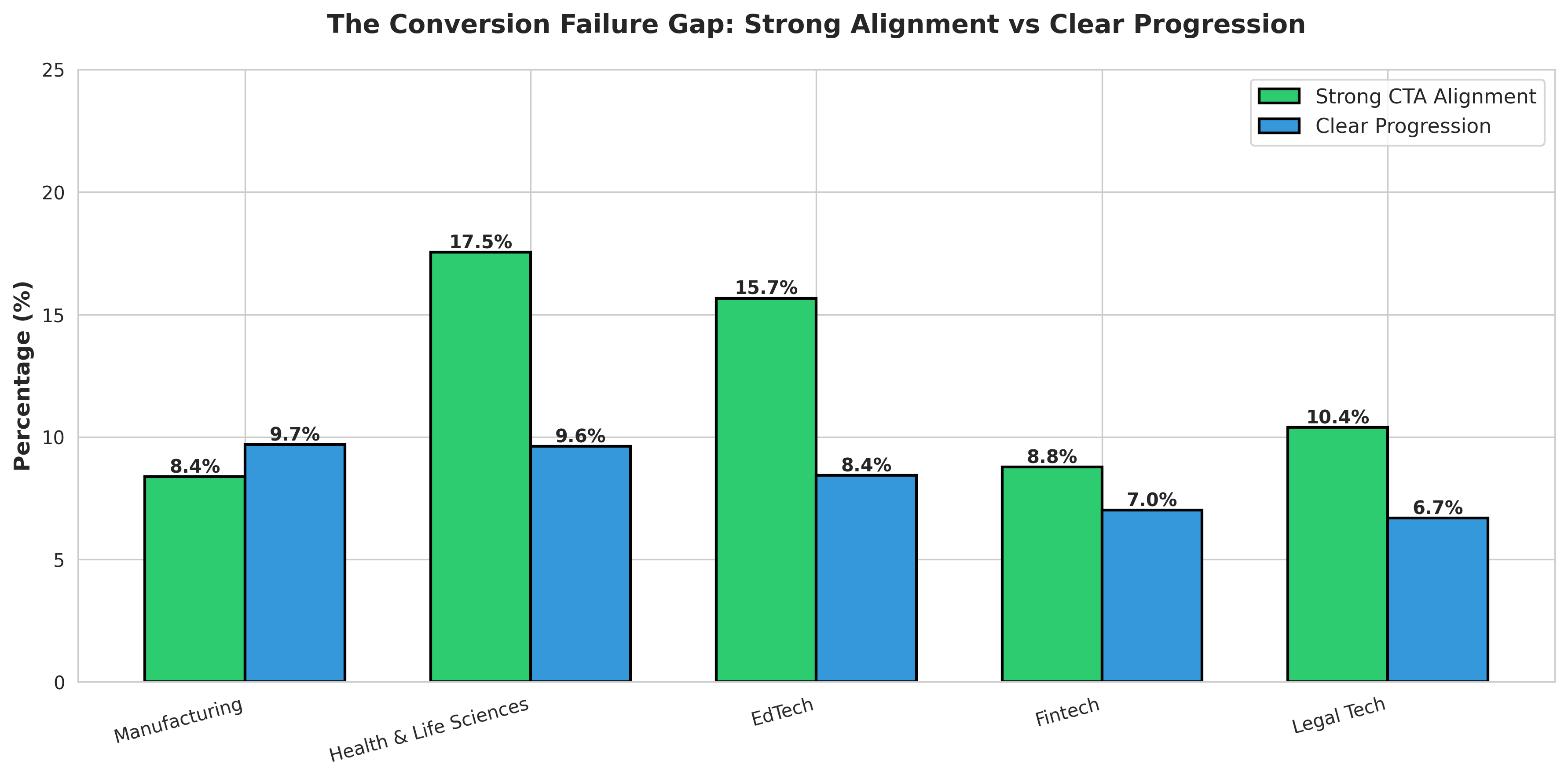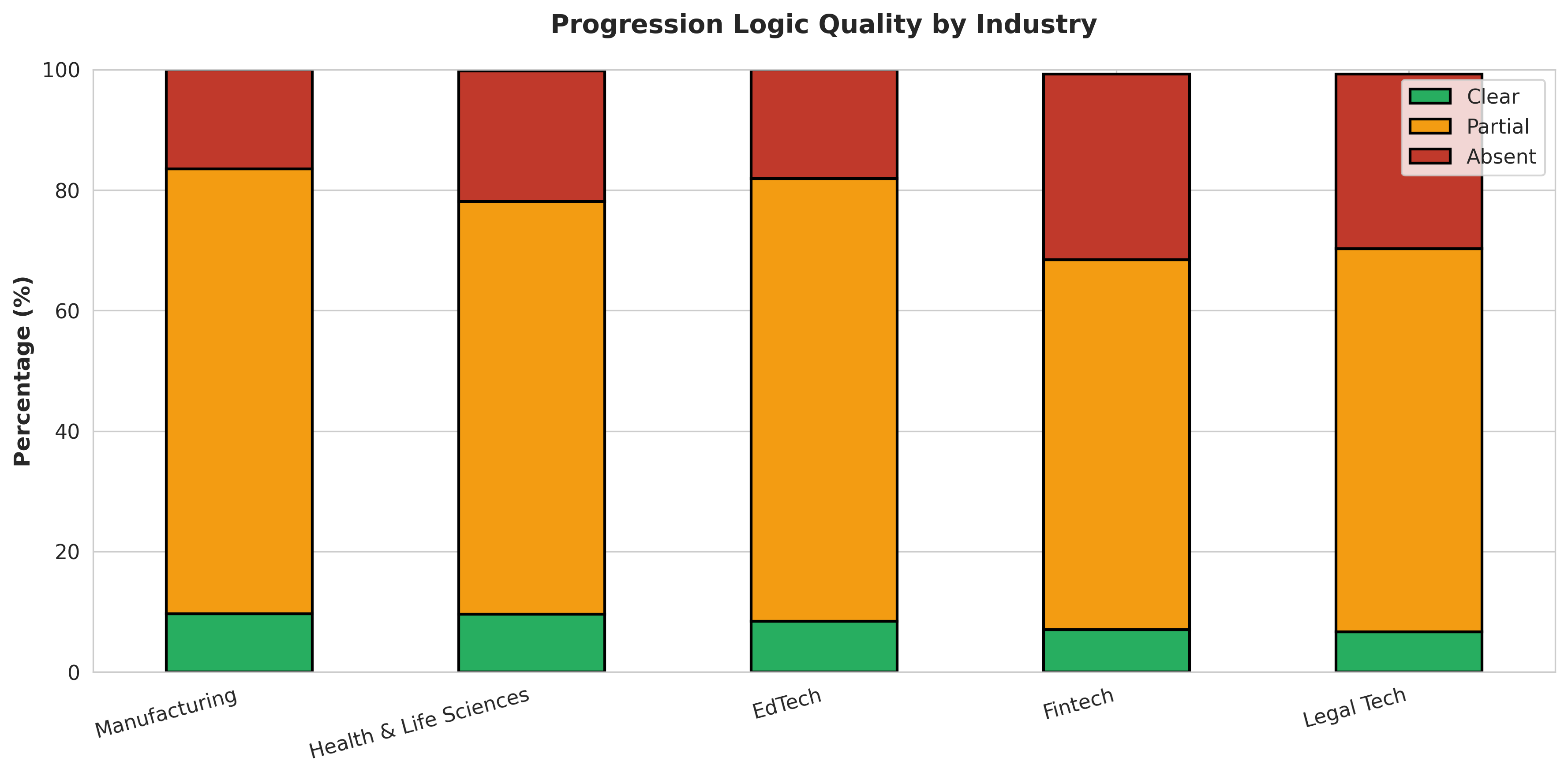In the dataset, clear progression logic was rare in every vertical, just 9.7% in manufacturing, 9.6% in health and life sciences, 8.4% in EdTech, 7.0% in fintech, and 6.7% in legal tech.