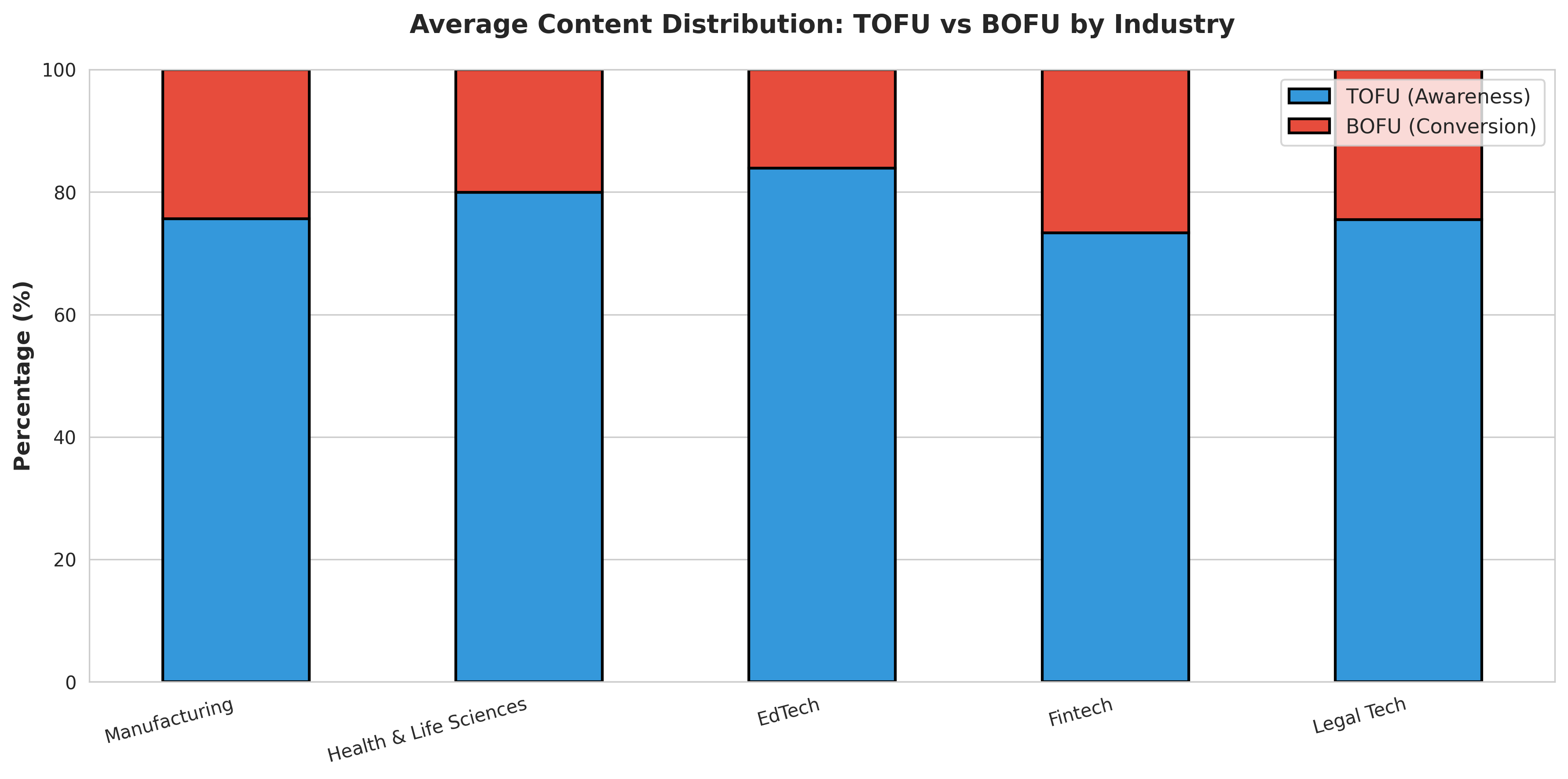 Chart 5: TOFU vs BOFU Distribution — Stacked bar showing the average content split between awareness (TOFU) and conversion (BOFU) content. EdTech is most TOFU-heavy at 83.9%, while Fintech is lowest at 73.3%