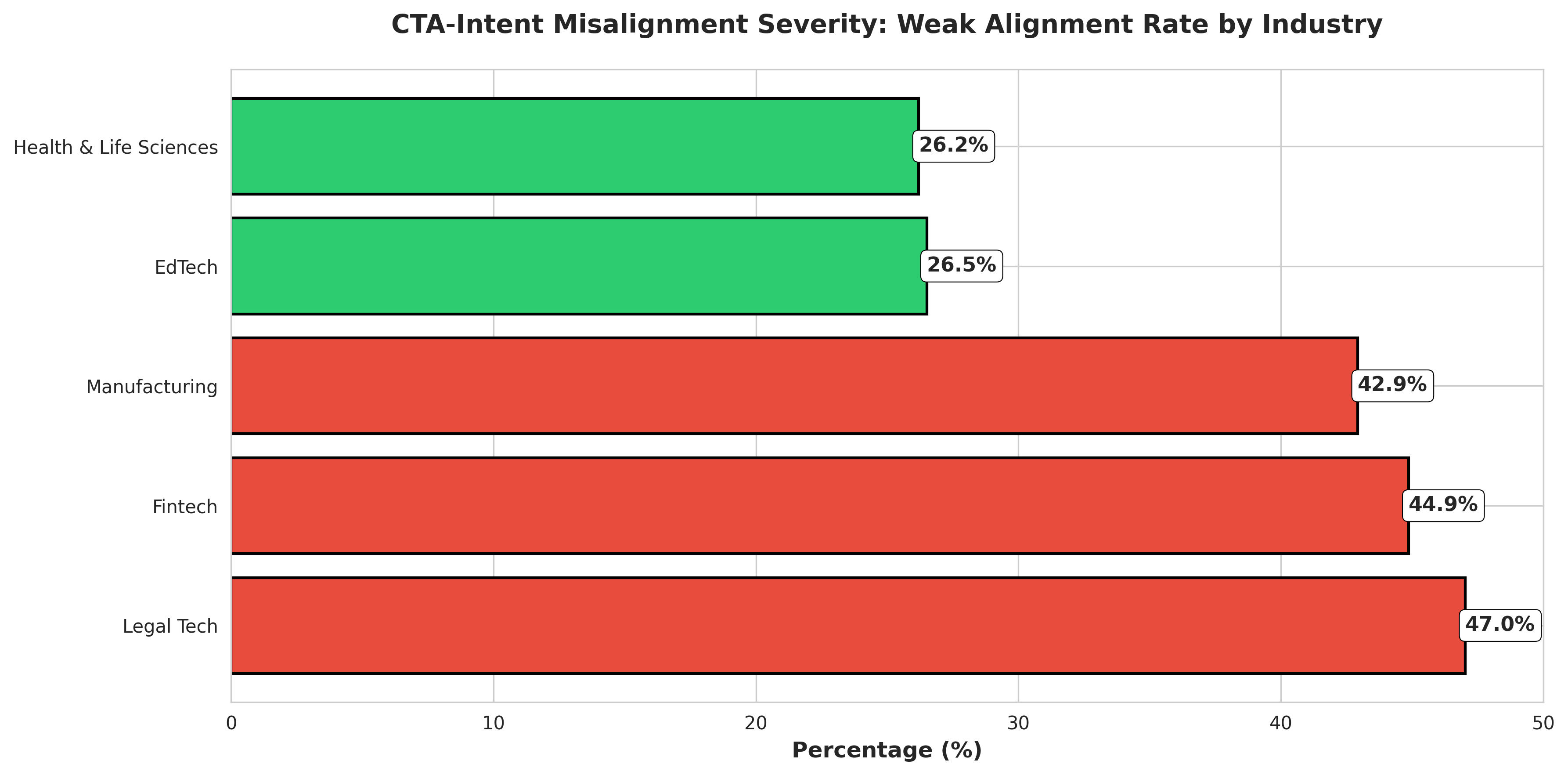 Chart 8: Weak Alignment Severity — Horizontal bar chart ranking industries by their weak CTA alignment rate. Legal Tech is worst at 47%, followed by Fintech at 44.9%, showing these industries have the most severe misalignment between content intent and CTA commitment.