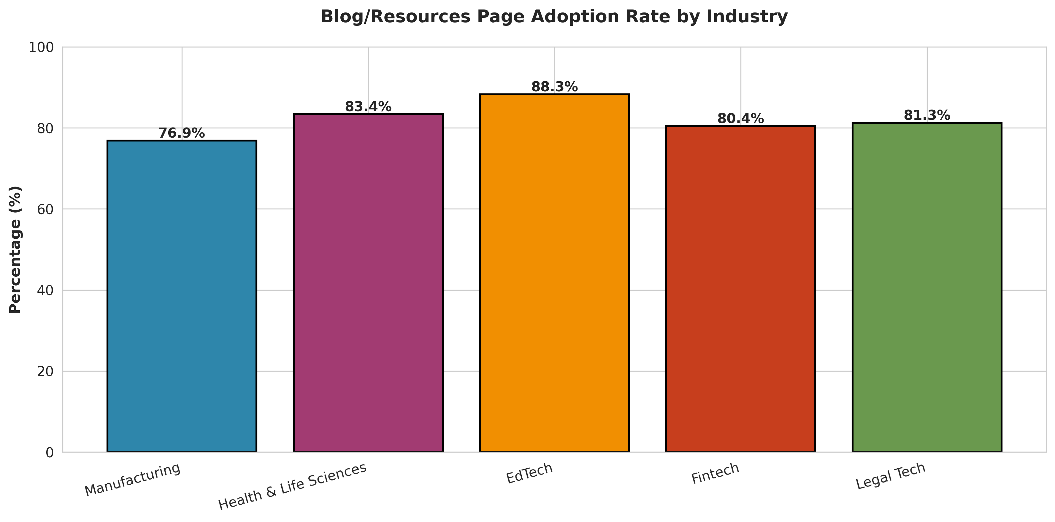 Chart 1: Blog Adoption Rates — Shows which industries have the highest percentage of companies operating a blog/resources page. EdTech leads at 88.3%, while all industries have strong adoption (76-88%).