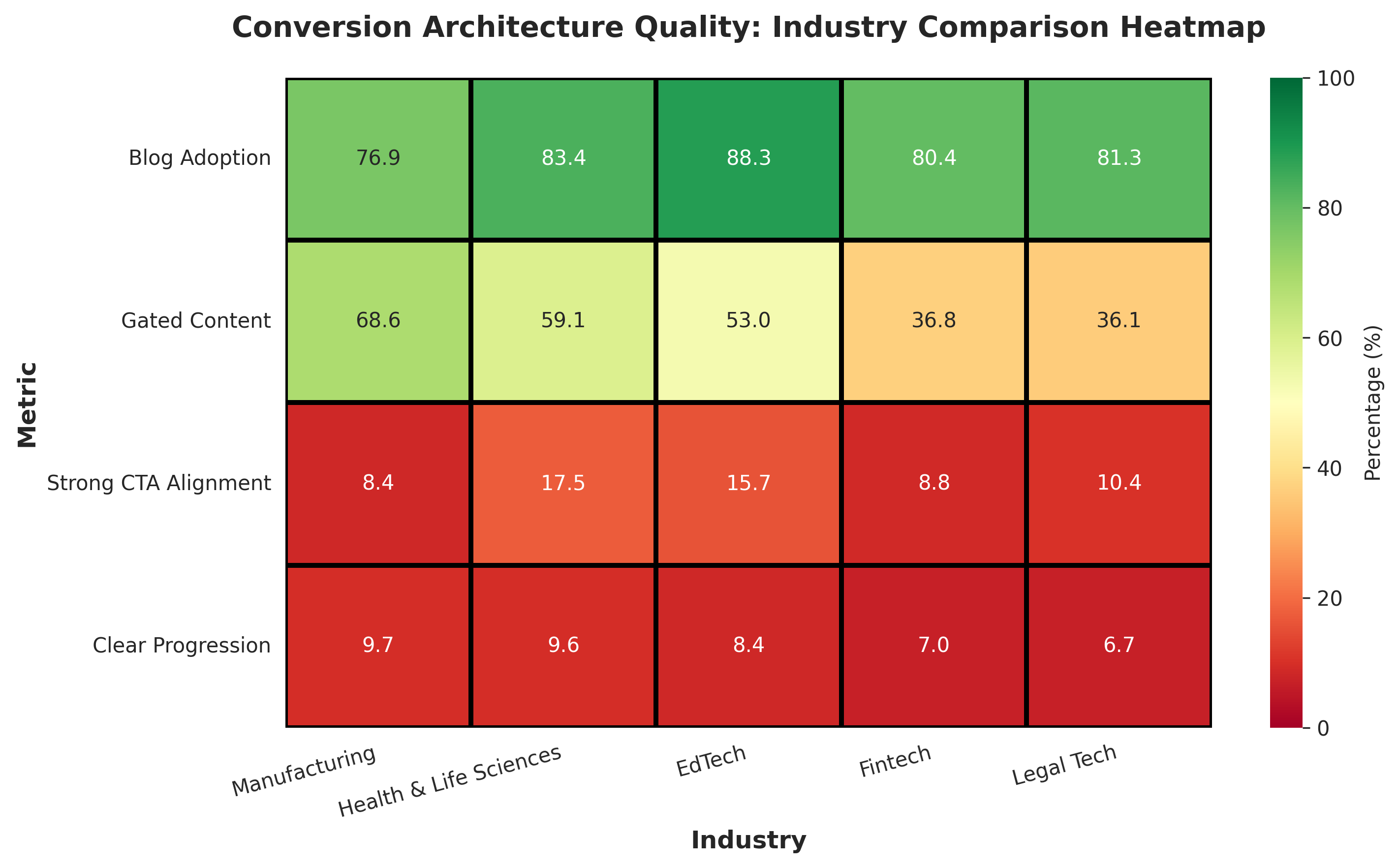 Fintech’s issue is sharper. It had relatively low gated-content adoption, heavy use of sales-first CTAs, and a meaningful amount of company-news-heavy content. For a quantitative, risk-sensitive buyer, this is a miss. Fintech buyers often need benchmark data, ROI models, compliance frameworks, and technical de-risking before they want a sales call. The architecture rarely reflects that.
