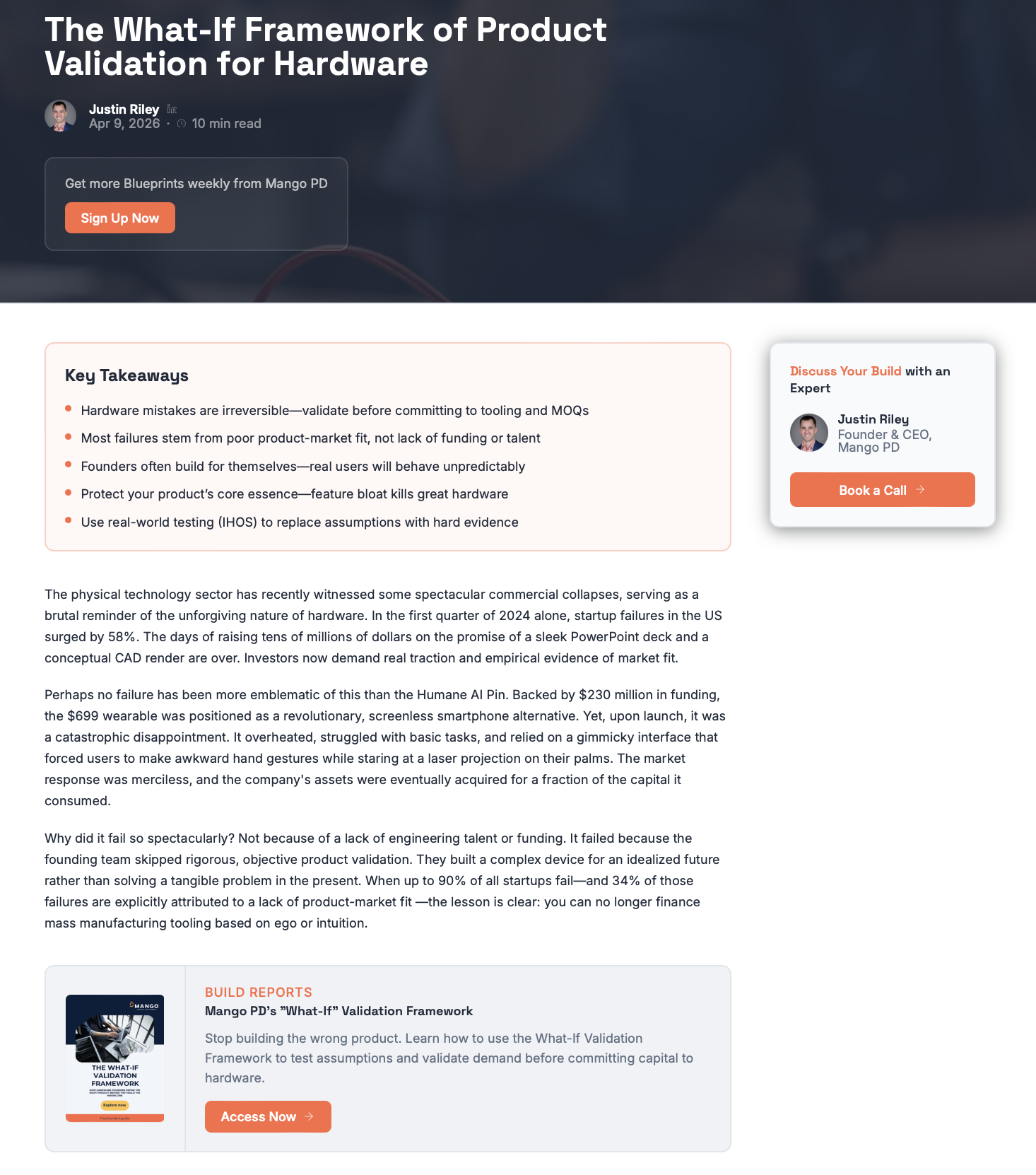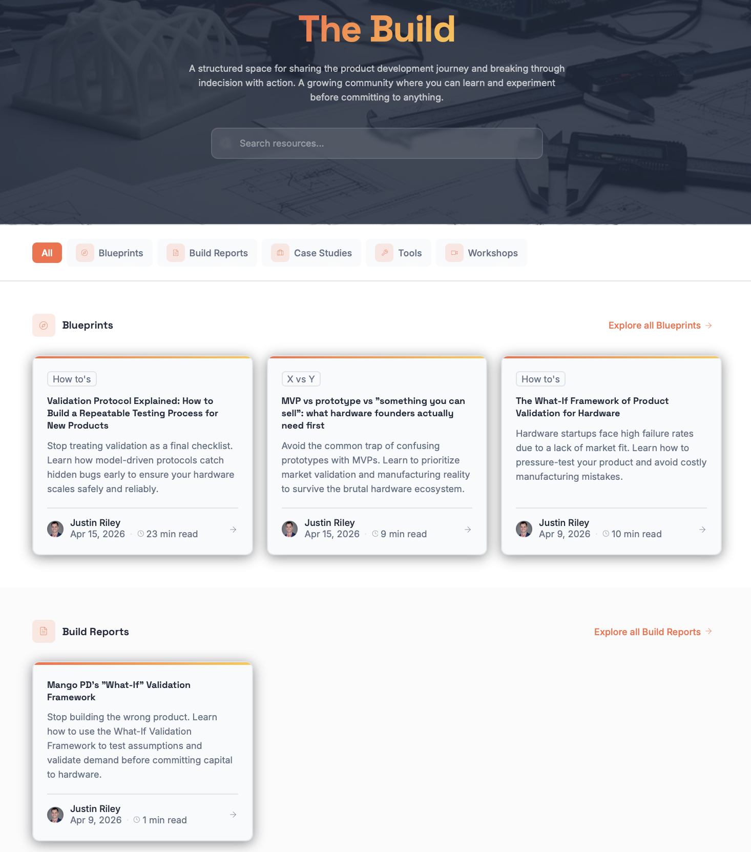 Example of a content product "The Build" tailored to appeal to consumer electronics founders embarking on their latest "Build".